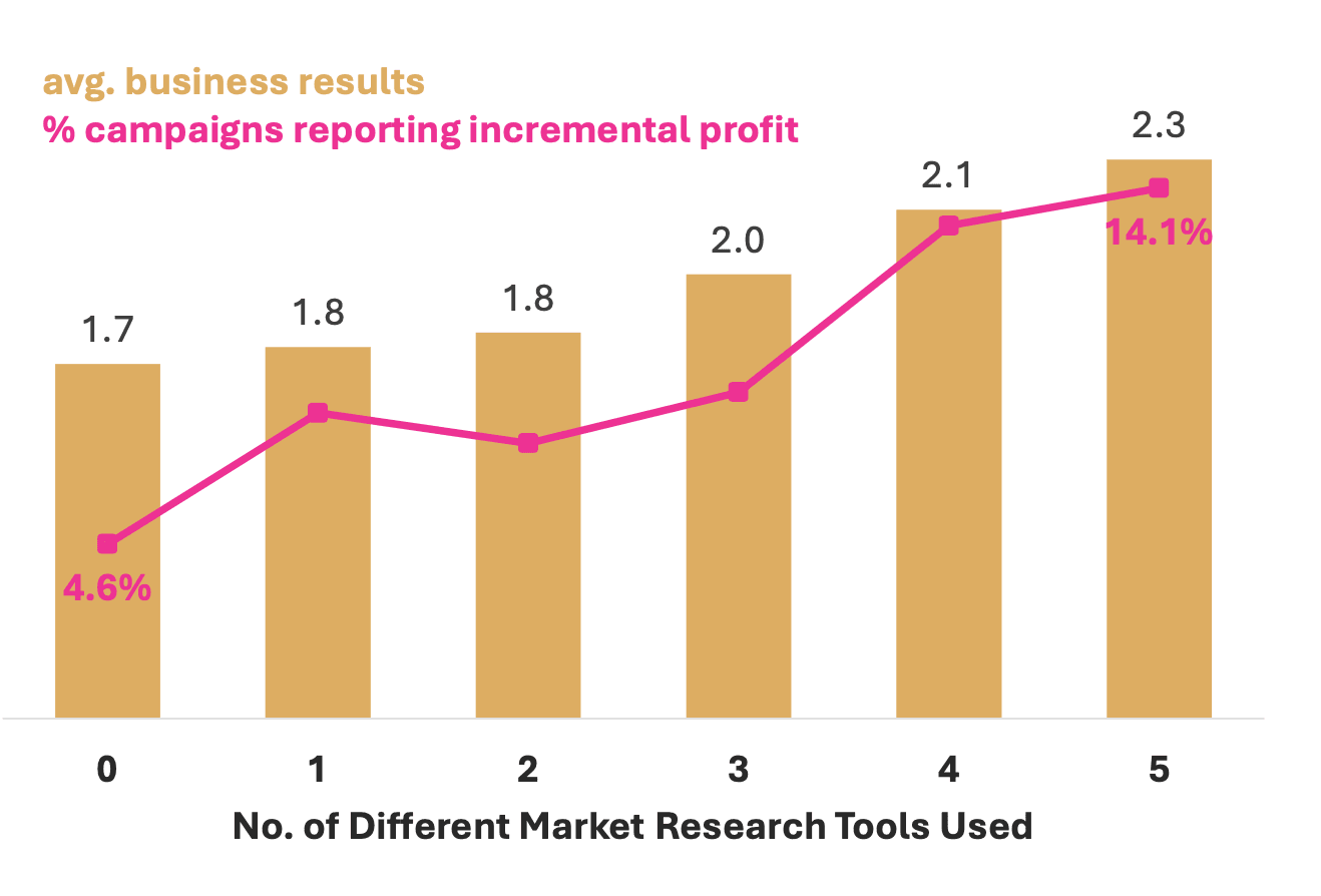 Cuando no se utiliza ninguna herramienta de investigación apenas 4.6% de las campañas logra ganancias incrementales. Al incorporar una o dos herramientas la efectividad comienza a subir. Con tres y cuatro la tendencia se consolida. Al llegar a cinco herramientas distintas el promedio de campañas con ganancia incremental se triplica alcanzando 14.1%.